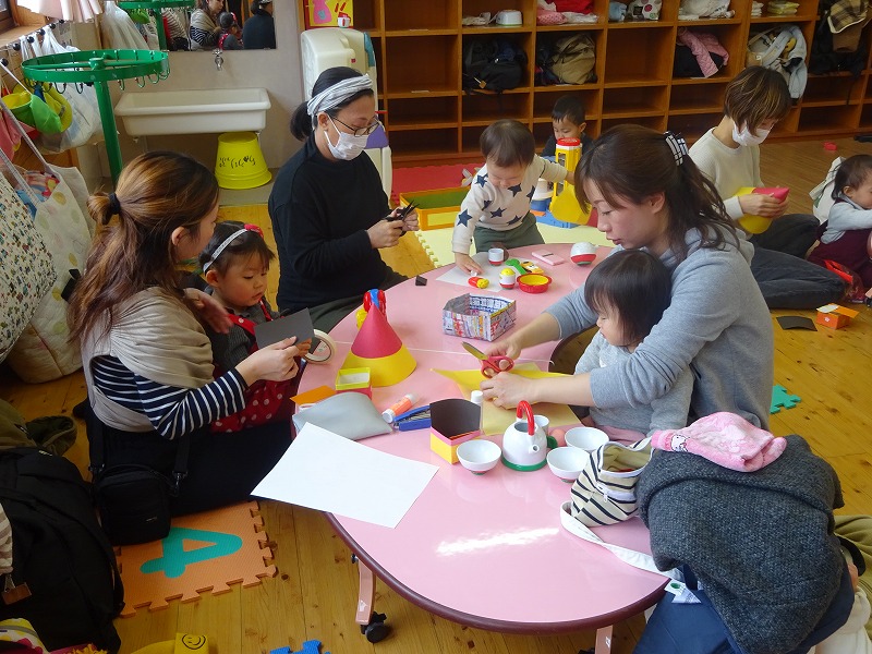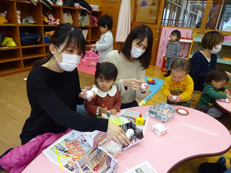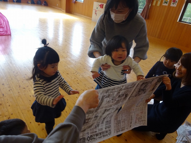 こりすくらぶ(乳幼児学級)の活動で「新聞紙遊び」を行いました。20組45人の親子の参加があり、新聞紙を突き破ったり、沢山ちぎって寝転んだり海にしたり、新聞紙シャワーをしたり・・・と、親子でダイナミックに遊びました。 |