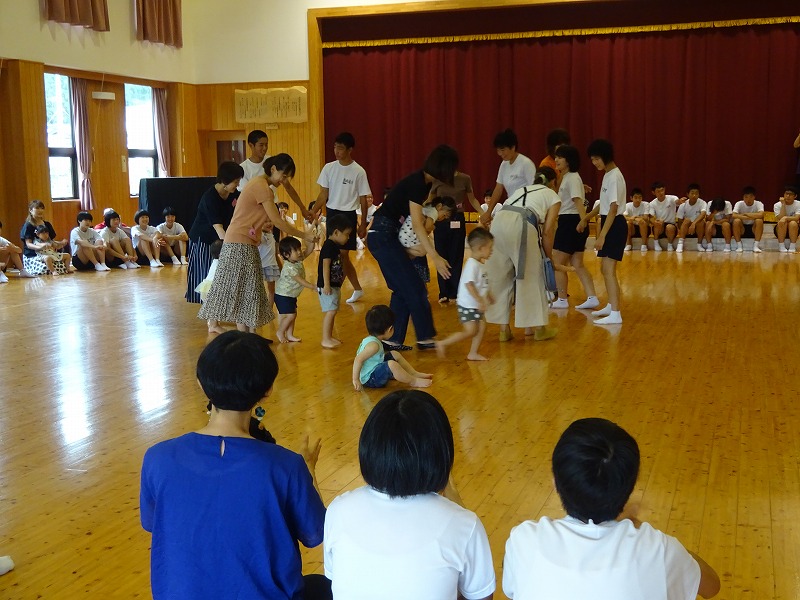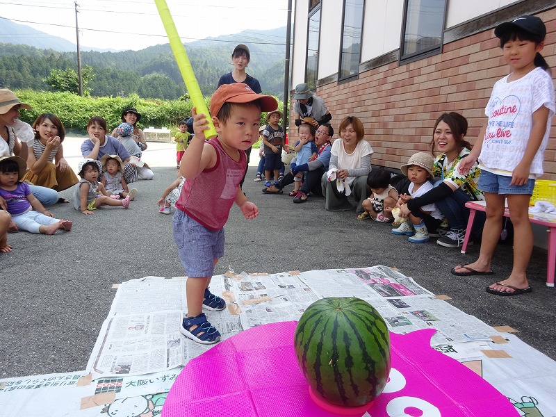 梅雨も明け、暑い日となりましたが、おひさま農園のスイカが大きく実り、食べごろとなったので、すいか割りを行いました。親子ですいかの重量当てクイズをしたり、棒を持って叩いたり・・・一喜一憂しながら夏ならではの食べ方ですいかの味を堪能しました。自分たちで育てたすいかの味は最高でした。可愛い口で頬張って食べる子どもたちの姿は可愛かったです。 |