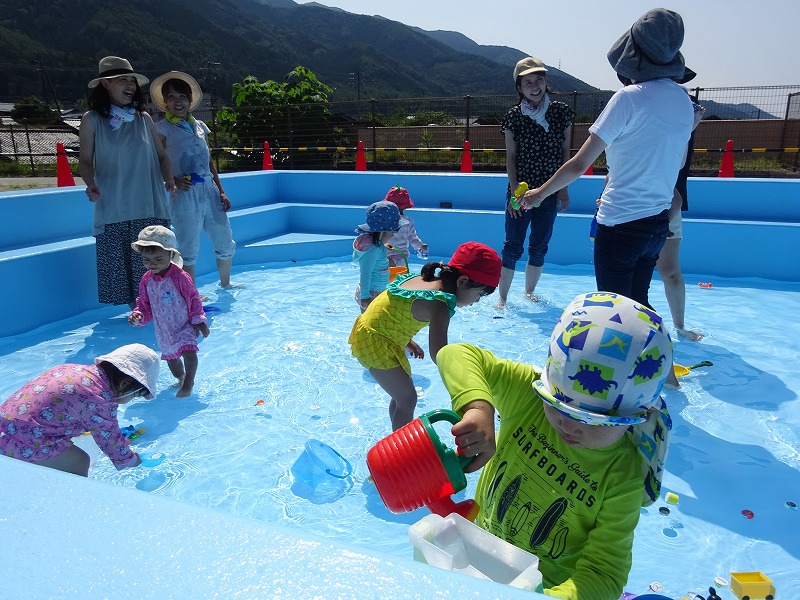 暑い日となり、絶好のプール日和となりました。12組27人の参加がありました。今年はこども園の大きなプールで、のびのびとプール玩具で遊んだり、親子で水かけっこをしたり、ワニ泳ぎをしたり・・・ダイナミックに水遊びを楽しむことが出来ました。夏ならではの遊びに子どもたちは大はしゃぎ!とても可愛かったです。 |