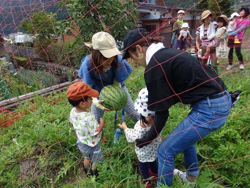 おひさま農園でスイカの収穫を行いました。待ちに待った収穫ということで、張り切って畑に向かいました。ツルについているひげの部分が茶色になると、採り頃のサインだと教えてもらうと、興味津々親子で収穫を楽しみました。勢いでスイカが割れてしまうハプニングもありましたが、急遽みんなで分けて畑で食べました。自分たちで育てたスイカの味は格別でした。 |