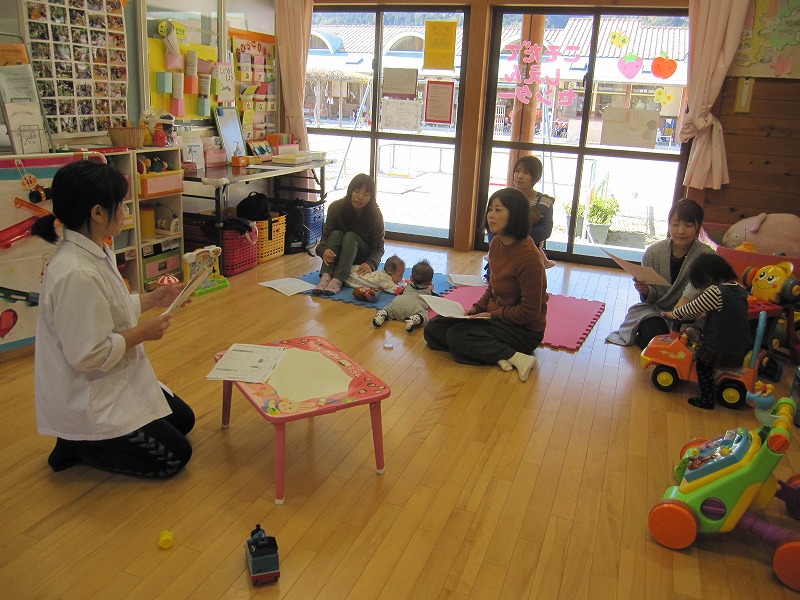 栄養士による『離乳食について』を行いました。 個々に合わせた進め方で焦らず急がず体調に合わせてやっていくことや、実際に月齢に応じた離乳食を展示し、量や切り方、軟らかさなどを見てもらい参考にしてもらいました。