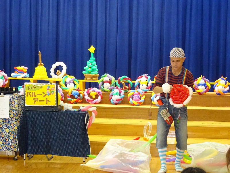 今年のクリスマス会も、バルーンアーティストのトッチーさんに来ていただきました。長細い風船が動物の乗り物に早変わり!トッチーさんのパフォーマンスに子どもたちは大喜びでした。