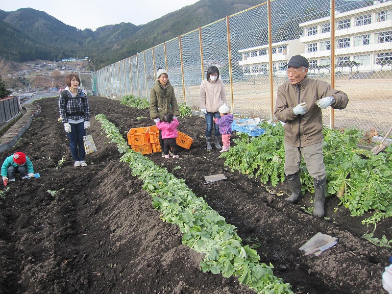 今年度、最後の農園活動でした。お母さんと一緒に、大きな大根とヤーコンを引き抜いた時の子どもたちの表情は、驚きと喜びでいっぱいでしたよ。来年の春まで、畑はお休みになります。「また来ようね」「また何を育てようか」と楽しみにしながら、畑を後にしました。