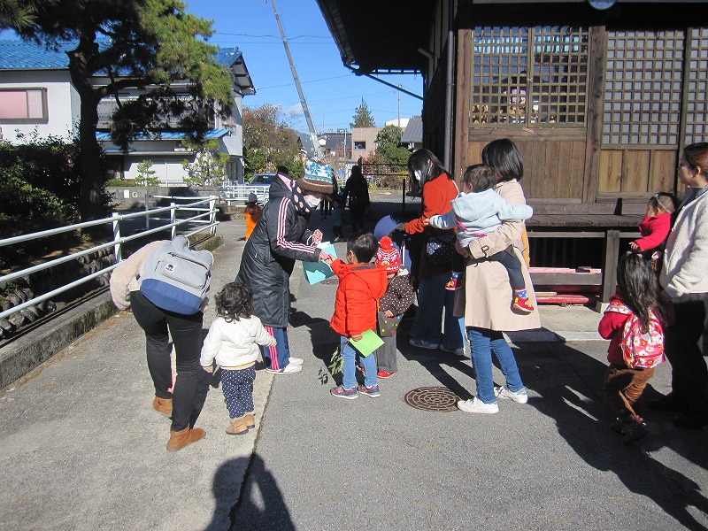 地図を持ち、ポシェットをかけて、萩原の町中探検を行いました。各ポイントで絵馬製作に必要なパーツを受け取りながら、車では通れない道を親子で散策し、写真付きのイノシシ年の絵馬づくりを楽しみました。