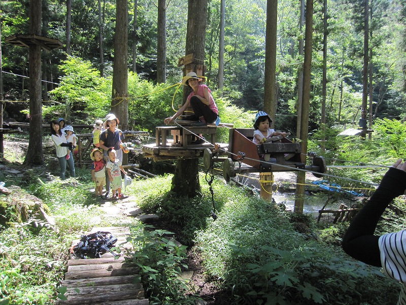 10組23名の参加がありました。最初は怖がっていた子どもたちも、お母さんと一緒ならと勇気を出してレースカーに乗ったり、綱渡りをして楽しみました。森の中でマイナスイオンを浴びながら、体を動かした後の炭火で焼くまきまきパンと焼きおにぎりは格別だったようで、どの子もあっという間に平らげていました。 |