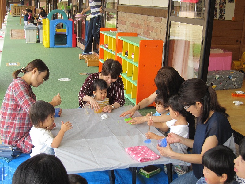水のり、絵の具、ほう砂、水を入れ、親子でグルグルかき混ぜると「すごーい!固まった!」と、あっという間に出来上がったスライムにビックリ! |