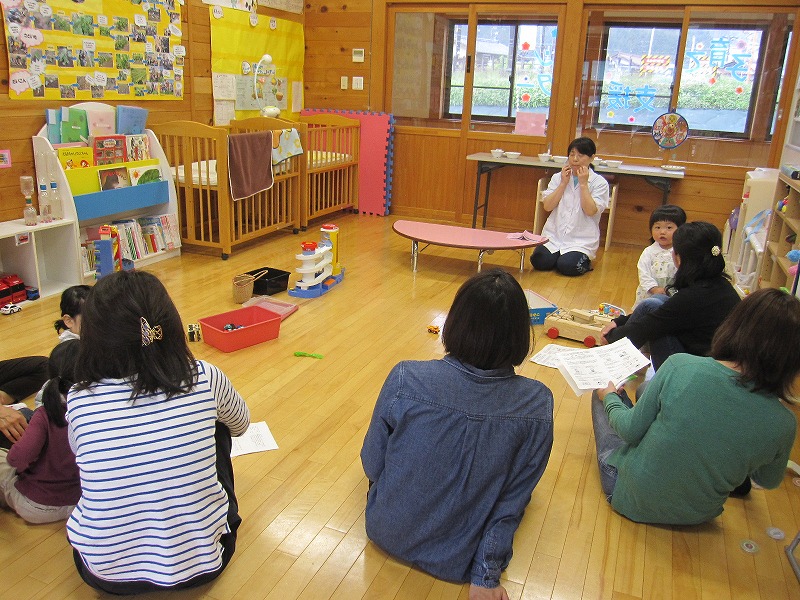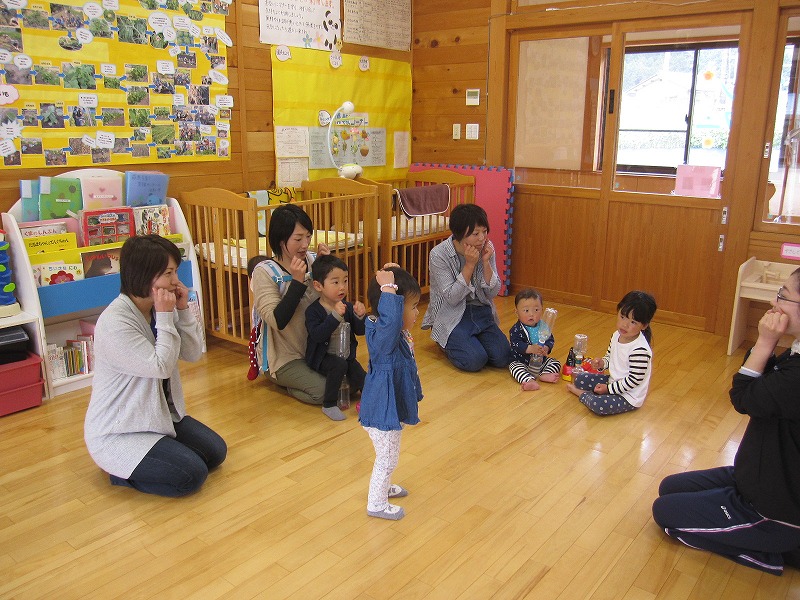 新企画『0.1歳児のリトミック』がありました。まだ歩けない子も多くいましたが、お母さんリードして楽しんだり、リズミカルなスキンシップで子どもたちもたくさんの笑顔が見られました。お母さんと子どもたちの間に、とても穏やかで楽しい時間が流れていましたよ。秋には2歳児を対象にしたリトミックを行います。たくさんのご参加をお待ちしております。 |