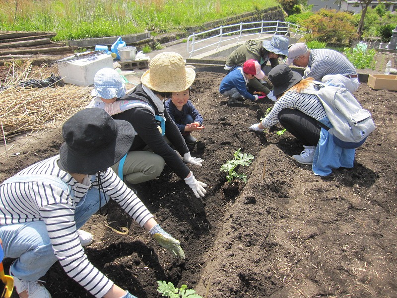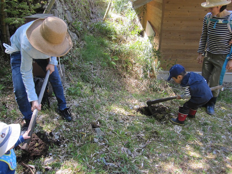 小坂のふれあいの森で竹の子掘りをしました。初めて竹の子を掘る方もいましたが、子どもと一緒に「よいしょよいしょ」と、声をかけながら楽しんで掘ることができました。子どもたちは竹の子を嬉しそうに持ち、「おもいな〜」と運んだり、タンポポを探し歩くなど、春の自然も満喫できたようです。 |