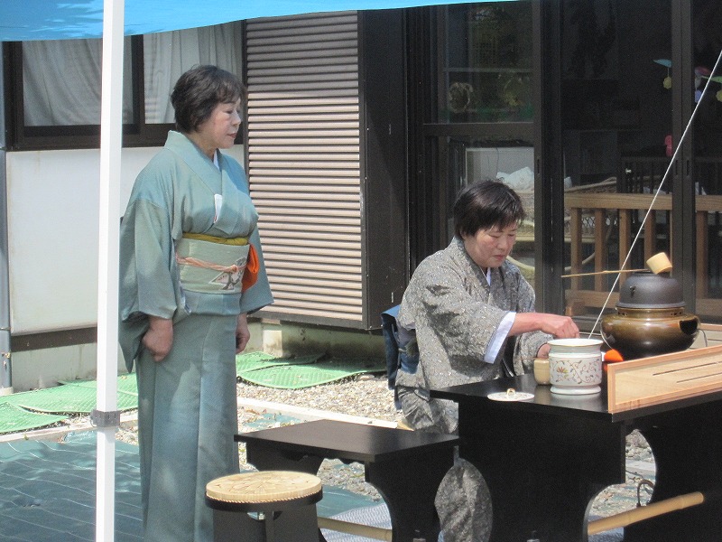 平成23年から、8回目を迎えた野点(のだて)は25組の参加がありました。中庭に設置した茶釜でお抹茶を点てるところを見ながら、お菓子とお抹茶を頂きました。非日常の体験は毎年喜んで頂けます。 |