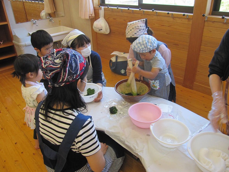 先日、自分たちで摘んだよもぎを下処理して持参していただき始まった「あねかえし作り」 |