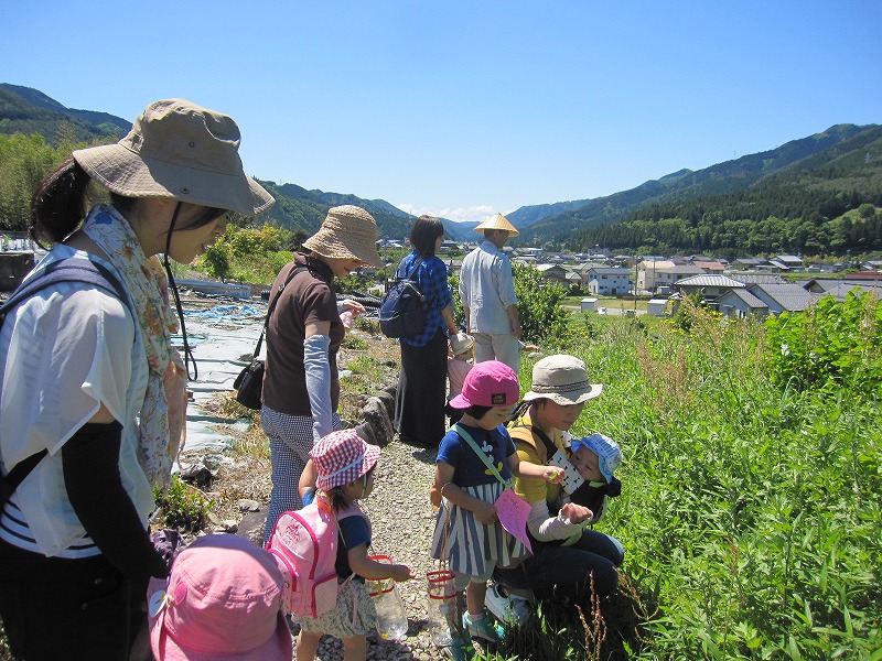 『じいじとばあばとお散歩しよう』を行いました。上村周辺をおさんぽビンゴカードを持って虫、草花、かに、飛行機など12種類を探しながら歩きました。孫と一緒に手を繋いで歩いてみえる姿は、とてもほのぼのとして温かかったです。 |