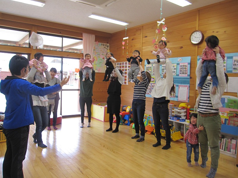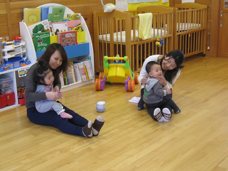 2月生まれの誕生会を行いました。今回、2月生まれのお子さんの参加はなかったのですが、1月生まれで前回参加できなかった、1歳になったお子さん2名が参加してくれました。手遊び「チャイム鳴らして」でお母さんに顔を触ってもらうと、とっても嬉しそうな表情をしていたのが印象的でした。 |