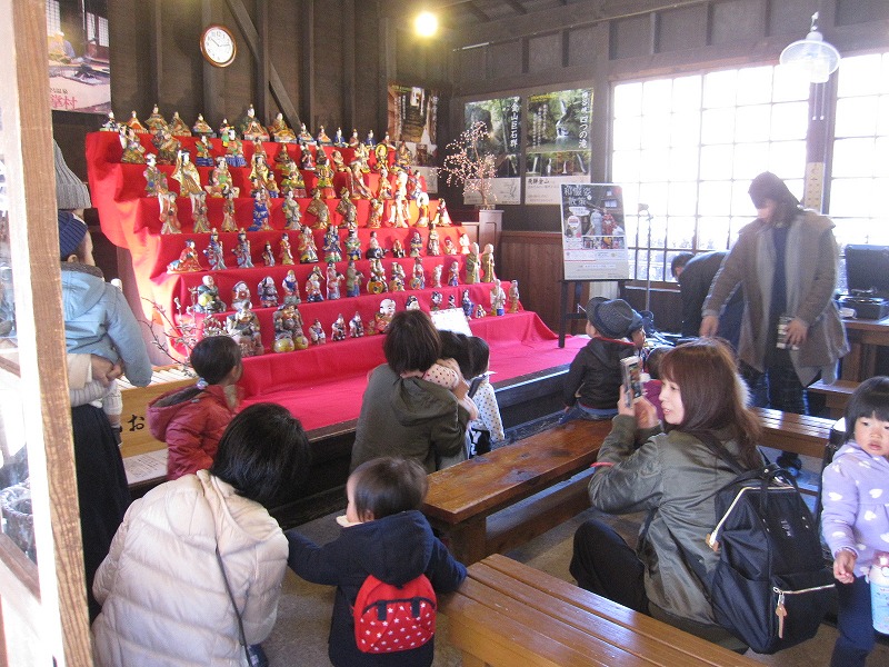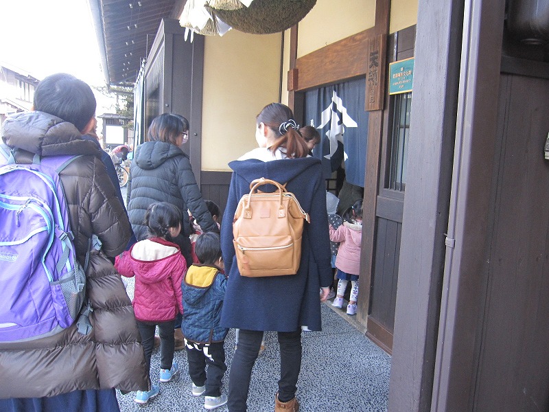飛騨のお酒で有名な天領酒造さんの酒蔵見学を行いました。こだわりぬいた美味しいお酒ができるまでの工程を見させていただき、参加された沢山の親子の皆さんは、案内して下さった方の説明を真剣に聞いてみえました。100年前に作られたというおひなさまや、素敵な手作りの木目込み人形の数々も見させていただき、一足早いがんどうちとなりました。 |