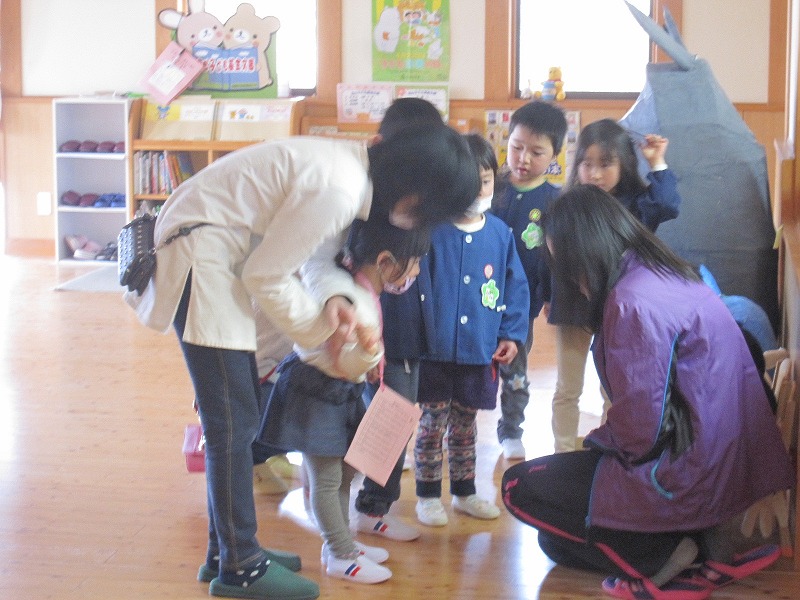 来年度年少にあがる親子を対象にした『お楽しみ会』。年中さんの素敵な歌声と未満児さんの大きなかぶの劇遊びを上手に座って観ていました。春になったら…と楽しみにしている子どもたち。期待が大きく膨らんだようです。“一年間のありがとう”の気持ちを込めて職員から贈った手作りのメッセージカード。中には涙する親さんの姿もありました。本当にありがとうございました。 |