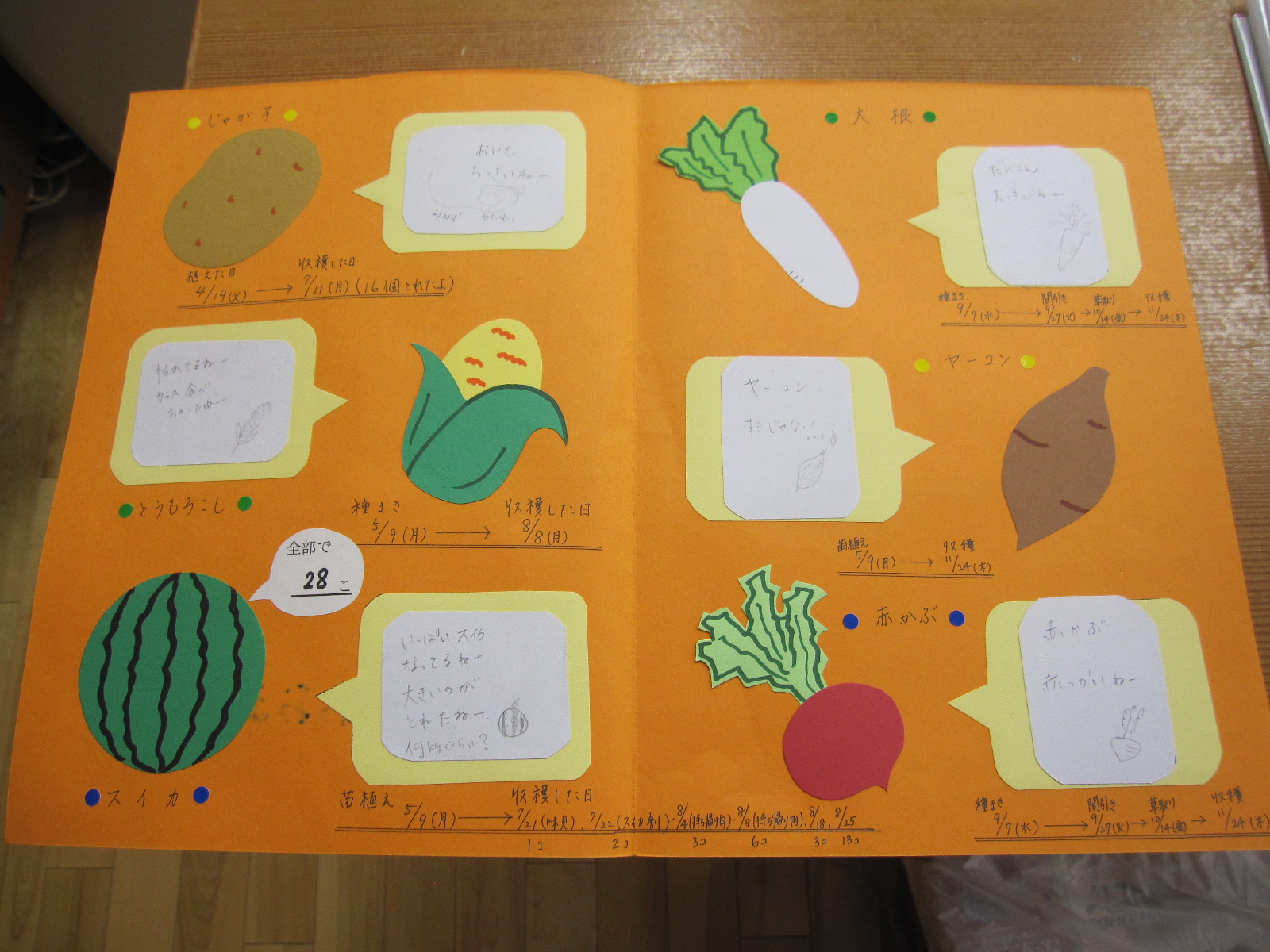 今年度はおひさま農園の活動に24組の方が登録して下さり、今日は終了式を行いました。1年間を振り返っての話や農園活動15日間の皆勤者発表などを行いました。そして、皆さんに今まで活動の中でお子さんのつぶやきが入った農園カードを渡しました。 |