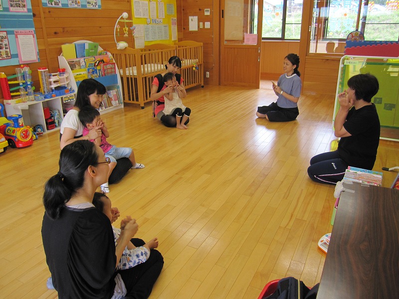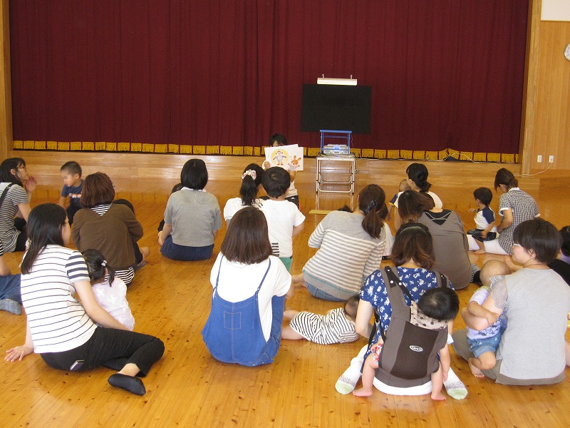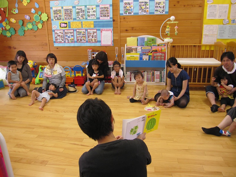 10組の親子が集まって下さいました。始めに、前回のすいかの重さ当てクイズの正解者発表と、プレゼントを渡しました。その後は、すいか割りの絵本を読み、園庭ですいか割りを行いました。皆が見守る中、少し照れながら笑顔で叩く子どもたちでした。お母さん方にも叩いてもらい、最後にはパカーンと見事に割れました。みずみずしいすいかを皆さんで美味しくいただきました。 |