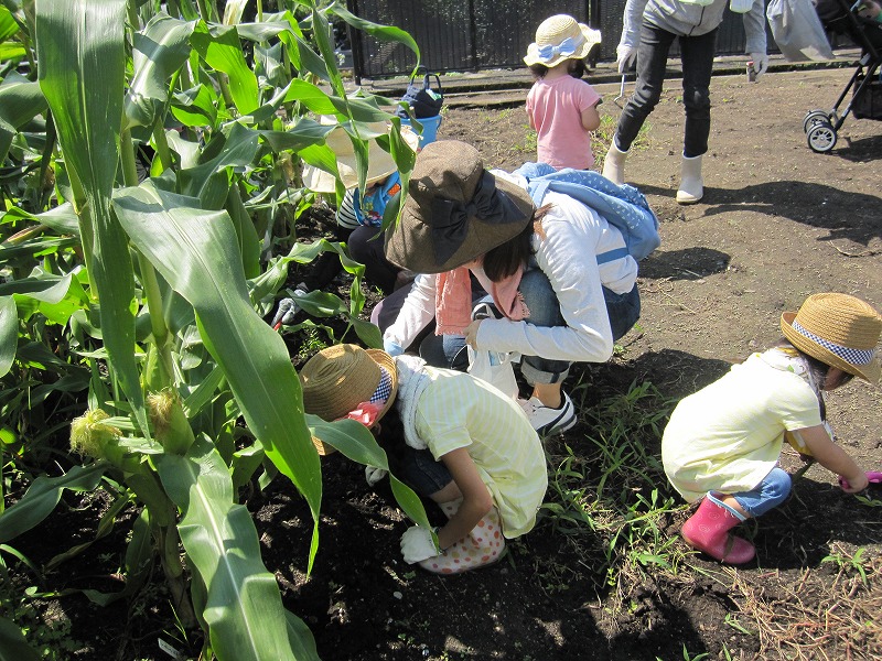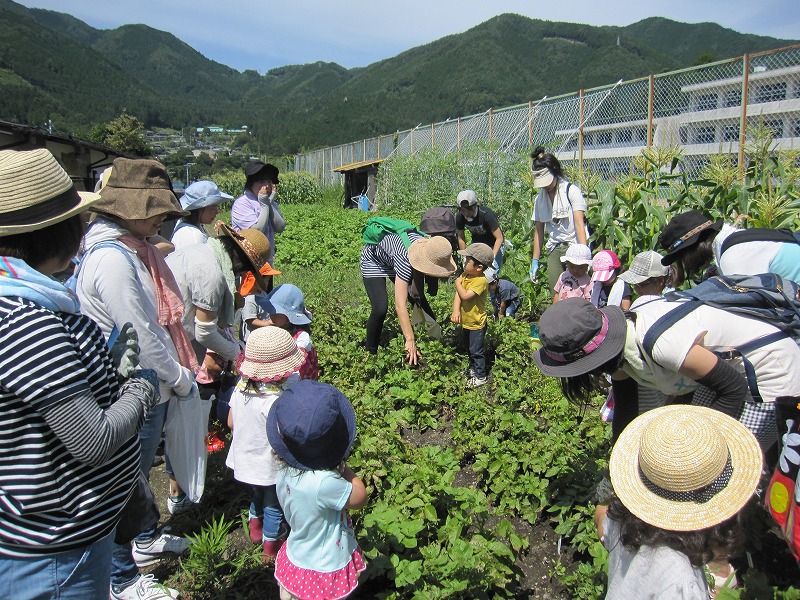 今日の農園Dayは草取りをしていただいた後、スイカはいくつ実になっているかを親子で数えたりして楽しみました。スイカ割りの為のスイカを持ってもらい、どれくらいの重さがあるかを予想していただきました。お楽しみの時間は、事前に収穫し、冷やしておいたスイカを、皆で美味しく食べました。暑い中の農園Dayではありましたが、楽しい時間となりました。 |