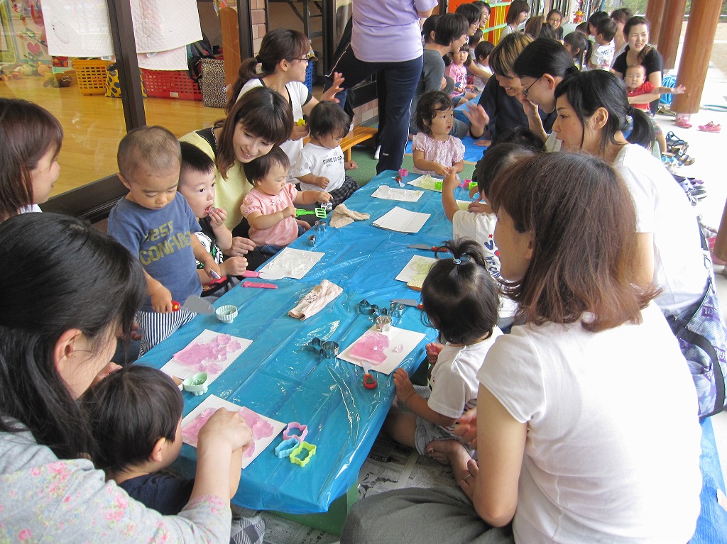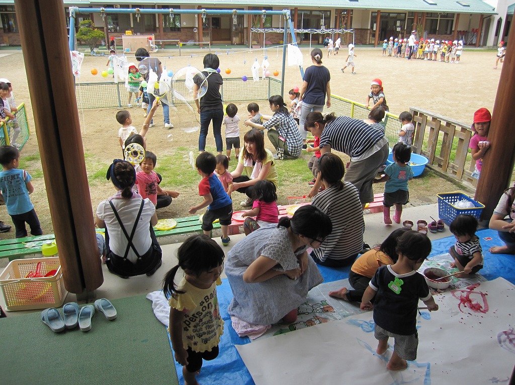 こりすくらぶで、シャボン玉・水鉄砲・絵の具でお絵かきを、3つのグループに別れ順番に行いました。 |