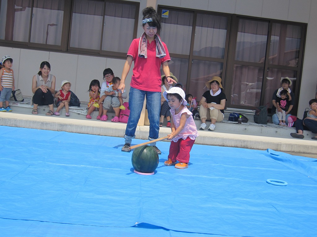 おひさま農園で取れたスイカを使い、『スイカ割り』を行いました。 |