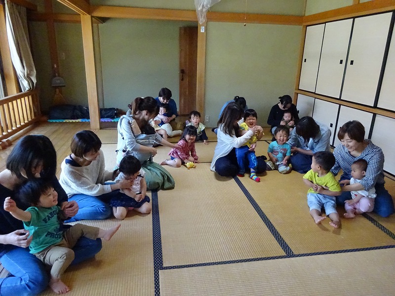 子育て広場の大きなイベント「野点」には、今年も楽しみにして下さっている方々が集まって下さいました。砂場に花。茶釜、野点傘、縁台に毛氈。広場の中庭は素敵な野点会場に変身しました。鯉のぼりの和菓子を美味しそうに頬張る子、上手に切って食べる子、お抹茶を飲み干す子等、子どもたちは色々な姿を見せてくれました。皆とてもお行儀よく座っていて感心しました。来年も沢山の方に参加していただきたいです。 |