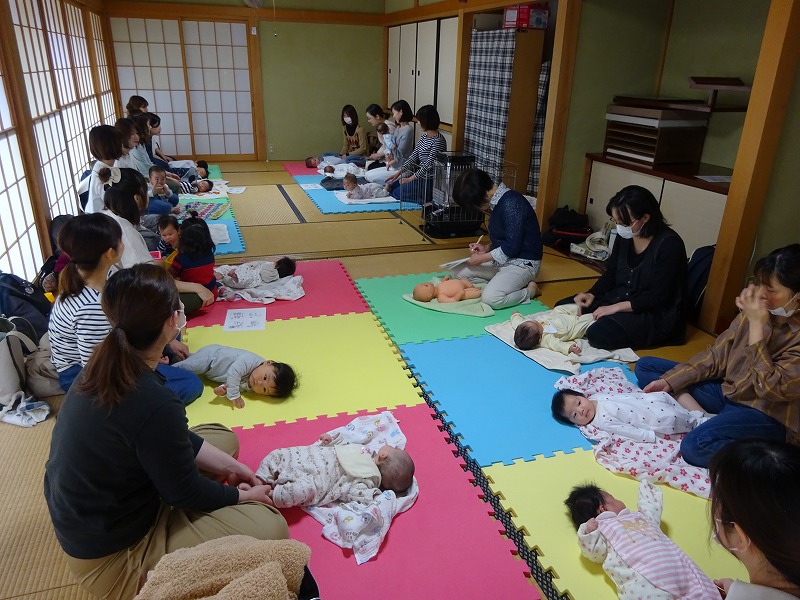 今回は記録更新の16組が参加。生後1ヶ月〜9ヶ月までのいろんな月齢の赤ちゃんに出会えました。Babyマッサージ初参加の方が半数もみえました。マッサージ方法は勿論、子育てについても先輩ママさんの話や先生のアドバイスをもらえたことがとても良かったと思います。新しいママ友の輪も広がることでしょう。 |