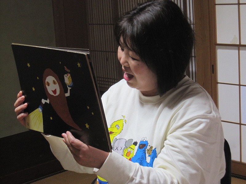 今回は手遊びが4種ありました。おなじみの『納豆』は皆大合唱できます。最後のエプロンシアターは「3匹のこぶた」。みんな先生の話術に引き込まれ「じーっ」と見入っていました。13組と多い参加でしたが、お母さんの側で上手に聴けていました。 |