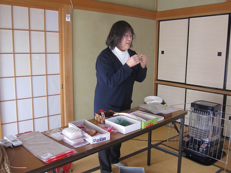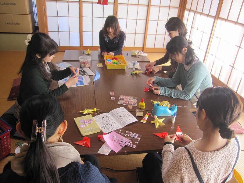 今回の折り紙教室は、クリスマスのオーナメントを教えて頂きました。こうぞの木に、ツリーと星とサンタを吊るしました。立体の星は少し難しかったようですが、シールやボンボンもあしらい、可愛いオーナメントが出来上がりました。 |