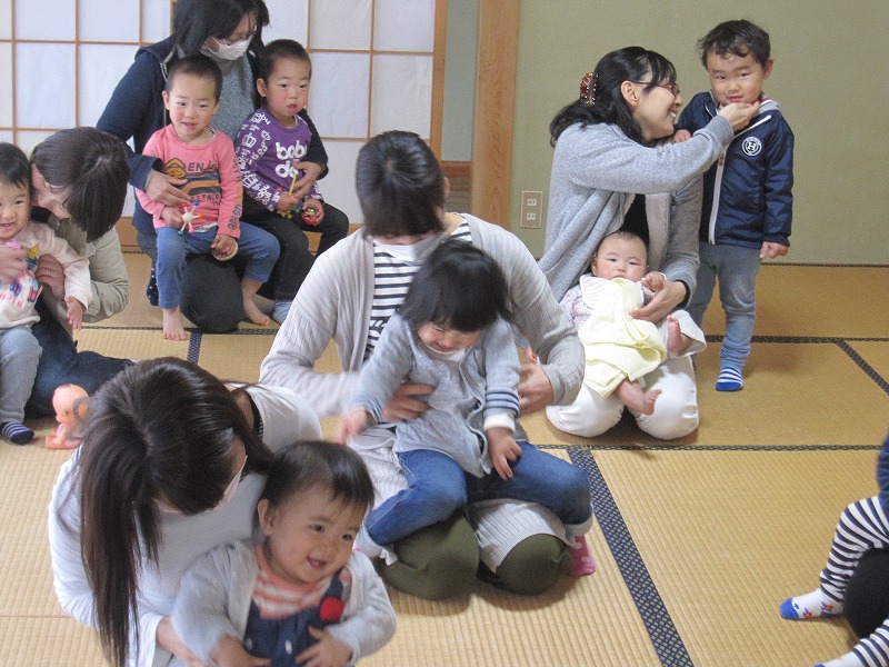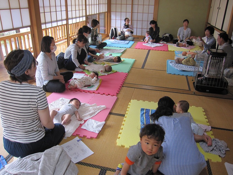 今回は史上2番目の10組が参加。2ヶ月から8ヶ月の子が集まりました。手順に沿ってマッサージを教えていただき、終了後には質問や相談に答えて下さいました。とても充実した時間となりました。次回は6月に予定しています。 |