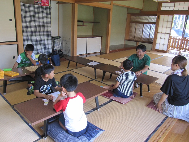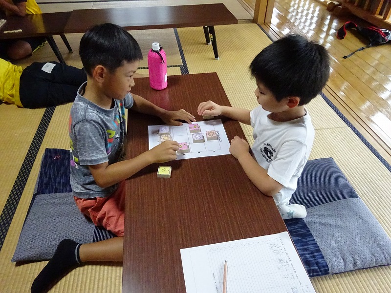 夏休み企画「将棋教室」第2日目が行われました。1年生の初心者の男の子が参加し、1日目の2人が教えながら対戦してくれたのが頼もしかったです。先生は「駒を取って取られてというのはいいが、取られるのみの取られ損はダメだよ。逃げるばかりもダメ。どんどん攻めた方がいい。」と丁寧に教えて下さいました。初心者の1年生の子の不安そうな顔がどんどん笑顔になっていったので、今後もやり続けてくれるといいなと思いました。 |