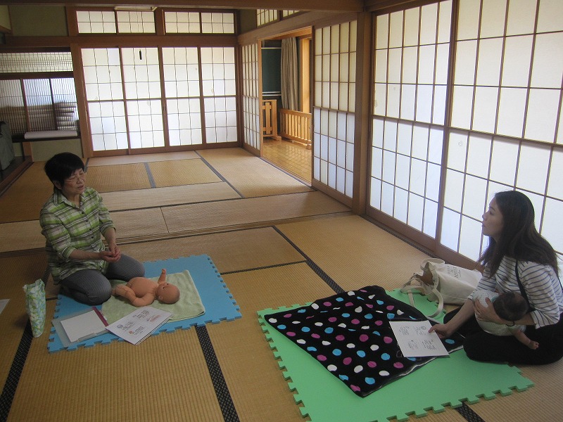 3ヶ月〜9ヶ月頃のお子さんとお母さんがみえ、5組10名の参加でした。丁度離乳食真っ最中の方が多く、園の栄養士から、レシピ・手間なくできる調理法や食材など詳しいお話を聞くことが出来ました。各月齢に合った実物の離乳食をみせてもらい、量・大きさ・硬さなど実感することが出来ました。 |