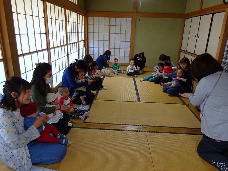 今年度初めての読み聞かせは手遊びから始まり、後半にはアンパンマンのエプロンシアターがありました。今まで来てくれていた3歳の子どもたちが入園しさびしくなりましたが、0.1歳児の子どもたちがお母さんと一緒にみんな喜んで見てくれました。 |