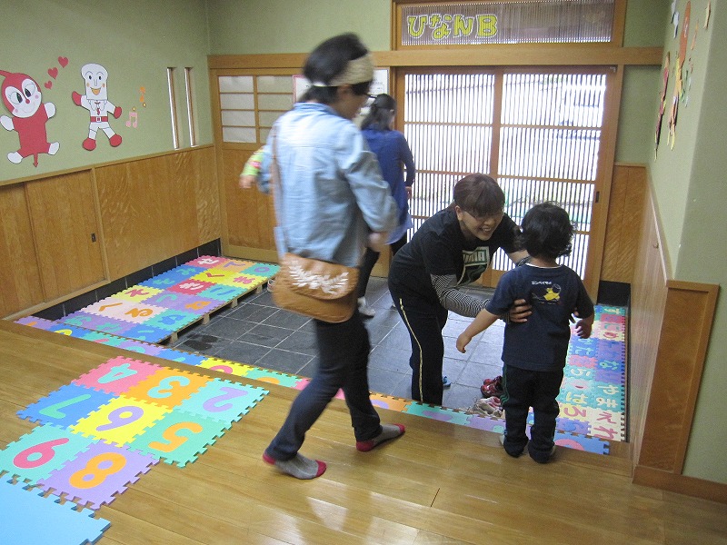 雨の為、園内散歩・遊戯室遊びに計画を変更しました。2組4名と少ない参加でしたが、ばあばに抱っこしてもらって園内をゆっくり見て回りました。遊戯室ではトンネルやバルーンを使って走ったりくぐったり寝転がったりと体を動かして遊びました。タンポポ笛・風車作りでは、ピーと音が鳴るたびに喜び、大好きなばあばと沢山触れ合うことが出来た時間となりました。 |