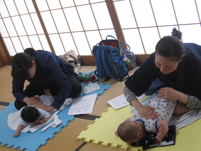 6組参加のうち初参加が4組みえました。お母さんたちの赤ちゃんを見るまなざしがとても優しくて幸福そうでした。今回は馬瀬や金山からも来られていて、親同士の交流もあり、新たな友だちづくりの場にもなりそうです。 |