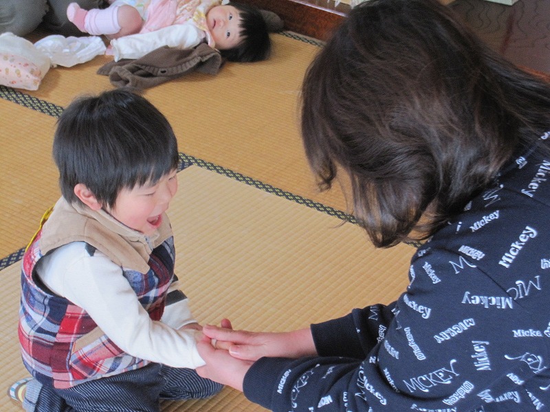 2月生まれの誕生会を行いました。今回、2月生まれのお子さんの参加はなかったのですが、1月生まれで前回参加できなかった、1歳になったお子さん2名が参加してくれました。手遊び「チャイム鳴らして」でお母さんに顔を触ってもらうと、とっても嬉しそうな表情をしていたのが印象的でした。 |