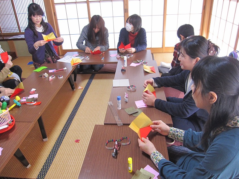 12cm四方で折ったおひなさま2体、4分の1の紙で折った雪洞と土台を2組、18cm四方の赤金両面折り紙で折った屏風。皆さん先生の手元に集中して頑張って折られました。仕上がった作品を前にとても満足そうな笑顔が並びました。3月3日のがんどうちには立体おひなさまも一緒に子どもたちを迎える事でしょう |