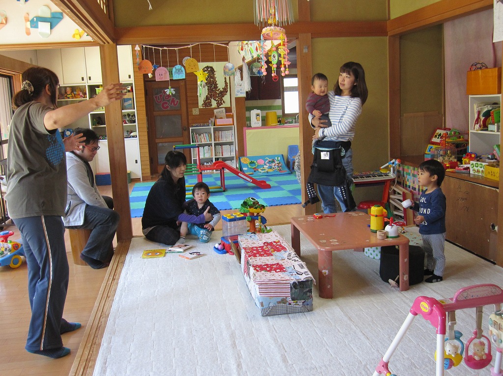 5月生まれの参加者は8組と多かった。年齢にもばらつきはあったものの、お母さんの膝の上で、歌ったり、踊ったり、楽しそうに参加することができていた。パネルシアターでは、参加者と職員が一体となって、楽しむことができた。良い誕生会となった。 |