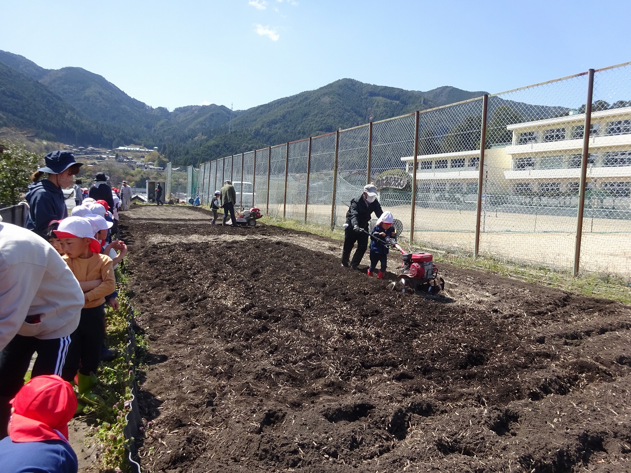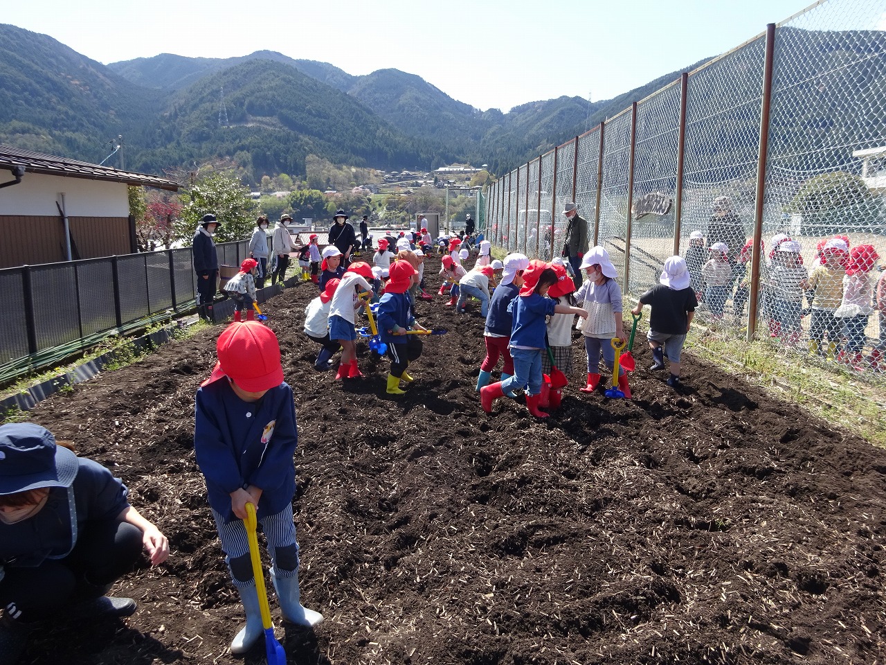 今年度も支援センターではおひさま農園で様々な作物を育てます。 親子で土に触れながら作物の世話をし、収穫する喜びを体感しませんか? 興味のある方は支援センターまで連絡してください。 詳しい内容は「あつまれちびっこだより5月号」で掲載する予定です。 画像は4月10日にみなみこども園の年長さんが農園開きで畑を耕してくれた時の様子です。