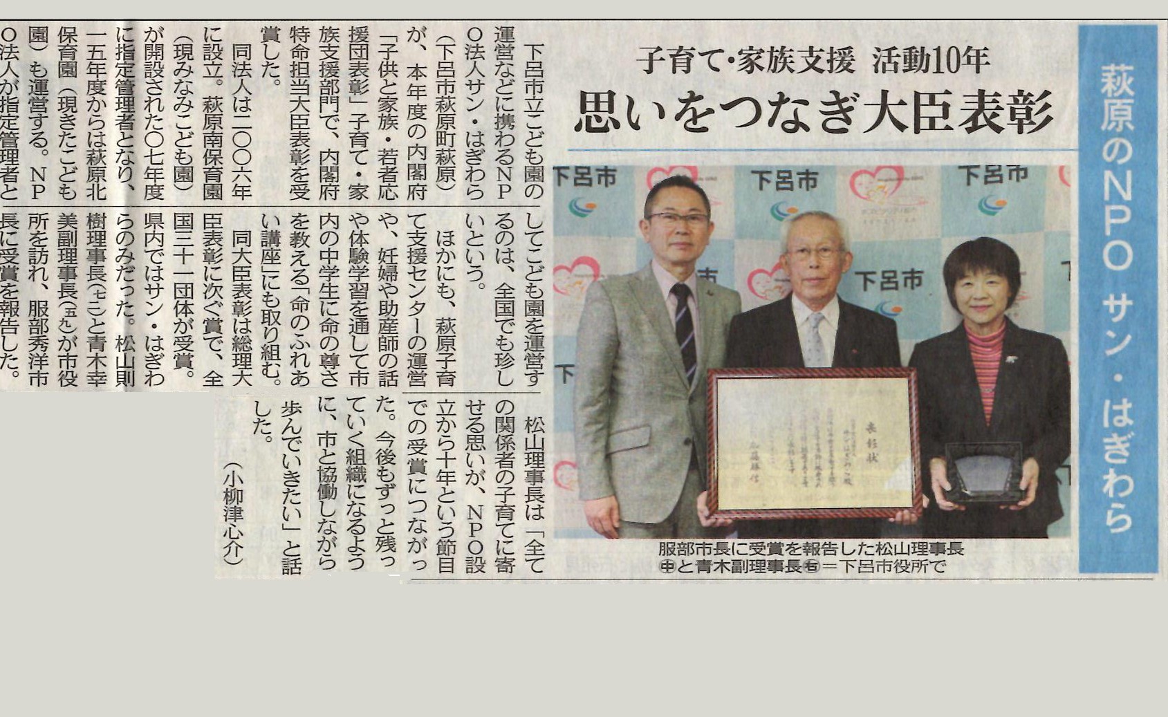 28年度 内閣府「子供と家族・若者応援団表彰」の16受賞者の1つにNPO法人サン・はぎわらが選ばれ、内閣府特命担当大臣表彰を受賞しました。