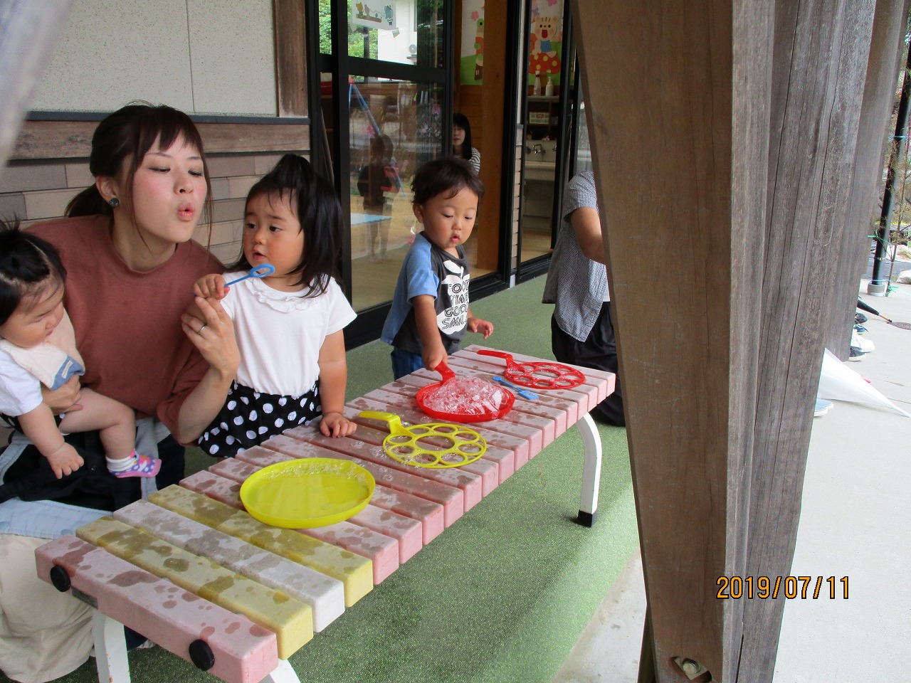 しゃぼん玉あそびと季節の壁面でさかな、かに、たこを手形で作りました。 あいにくの雨ふりでテラスで行いました。 風もない日でしたので、シャボン玉が高く飛ぶ様子を見ることはできず残念でした。 壁面の手形を親子で押してくれ、賑やかな壁面となりました。