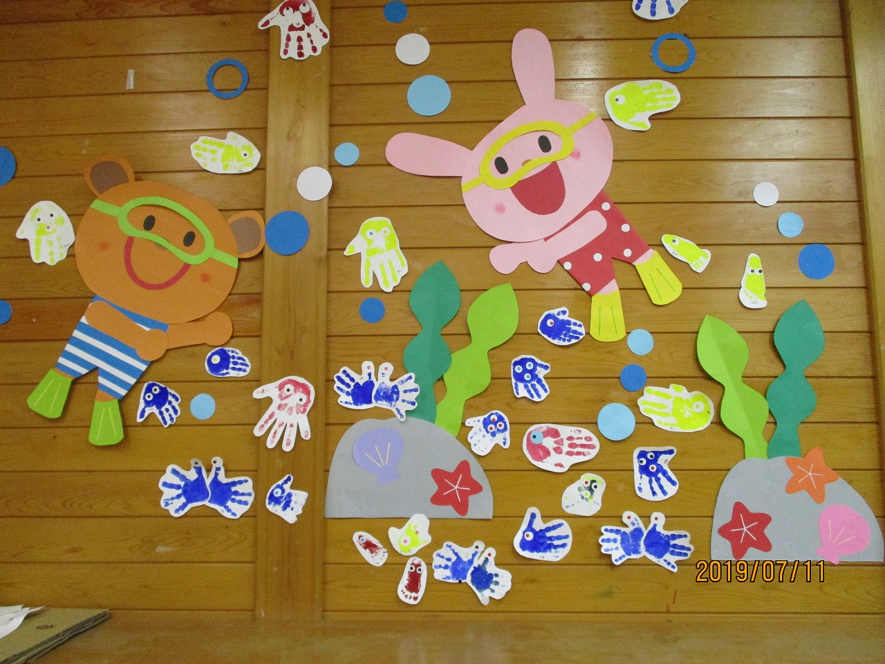 しゃぼん玉あそびと季節の壁面でさかな、かに、たこを手形で作りました。