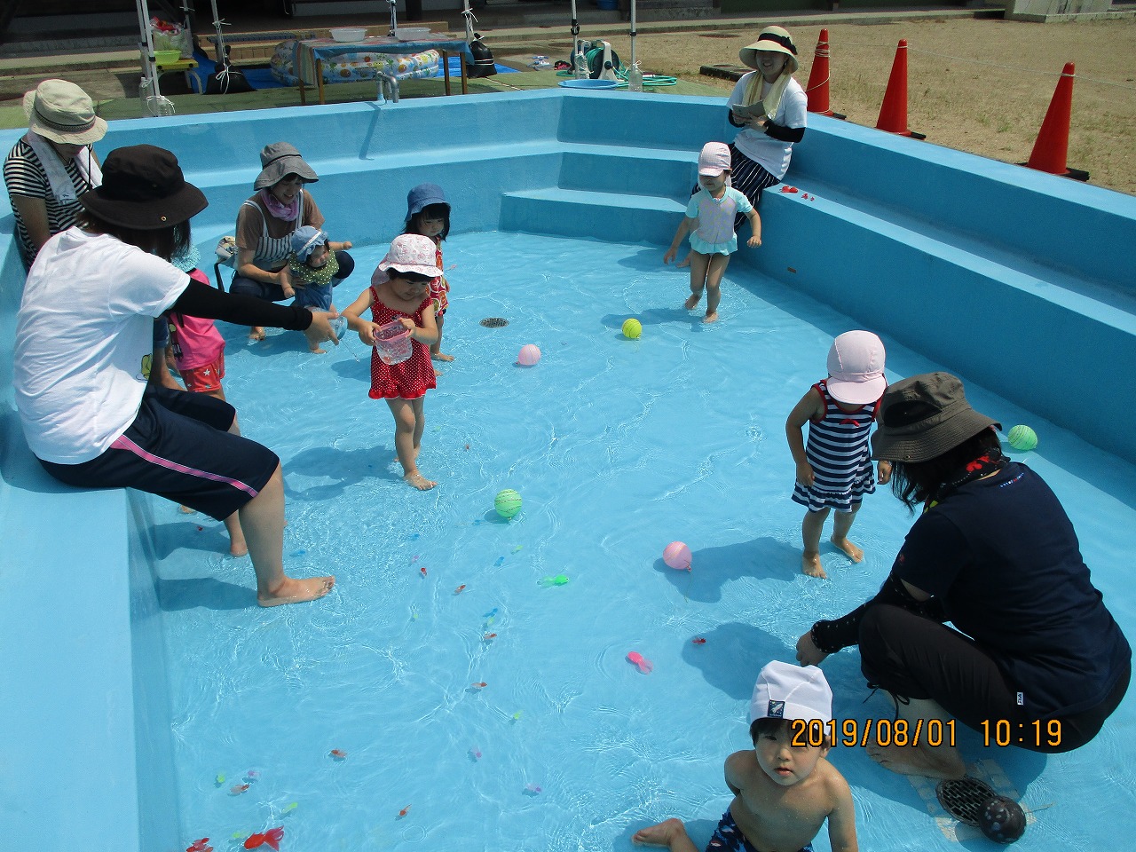 水で溶いた片栗粉で感触を味わいました。 子ども達は手から流れ出る感触が気持ちいと感じる子は少なく、すぐ手を洗って落としたい子が多かったです。お母さんたちは不思議な感触を楽しんでいました。 プールあそびでは金魚やヨーヨーをプールの中に入れてすくったりと楽しんでいました。 暑い日だったので水が心地よく感じ、最後まで楽しむことが出来ました。