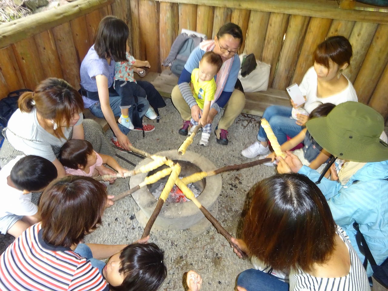 萩原子育て支援センターとのコラボで馬瀬の森のニンジャで遊びました。 魚釣りとCHIHIRO(ジップライン)のグループに分かれて体験しました。 CHIHIROの体験では勇敢に一人で乗れる子、怖がって断念する子もいました。 魚釣りではカラフルな魚を作ることを楽しみました。 まきまきパンの生地は、フワフワで簡単に棒にまくことができ、上手に焼いて美味しく食べることができました。