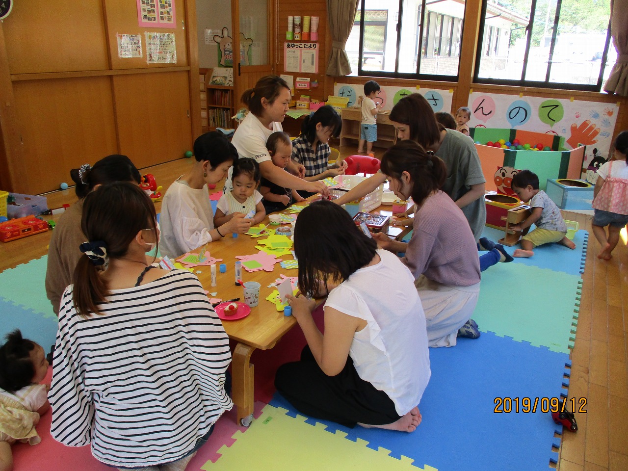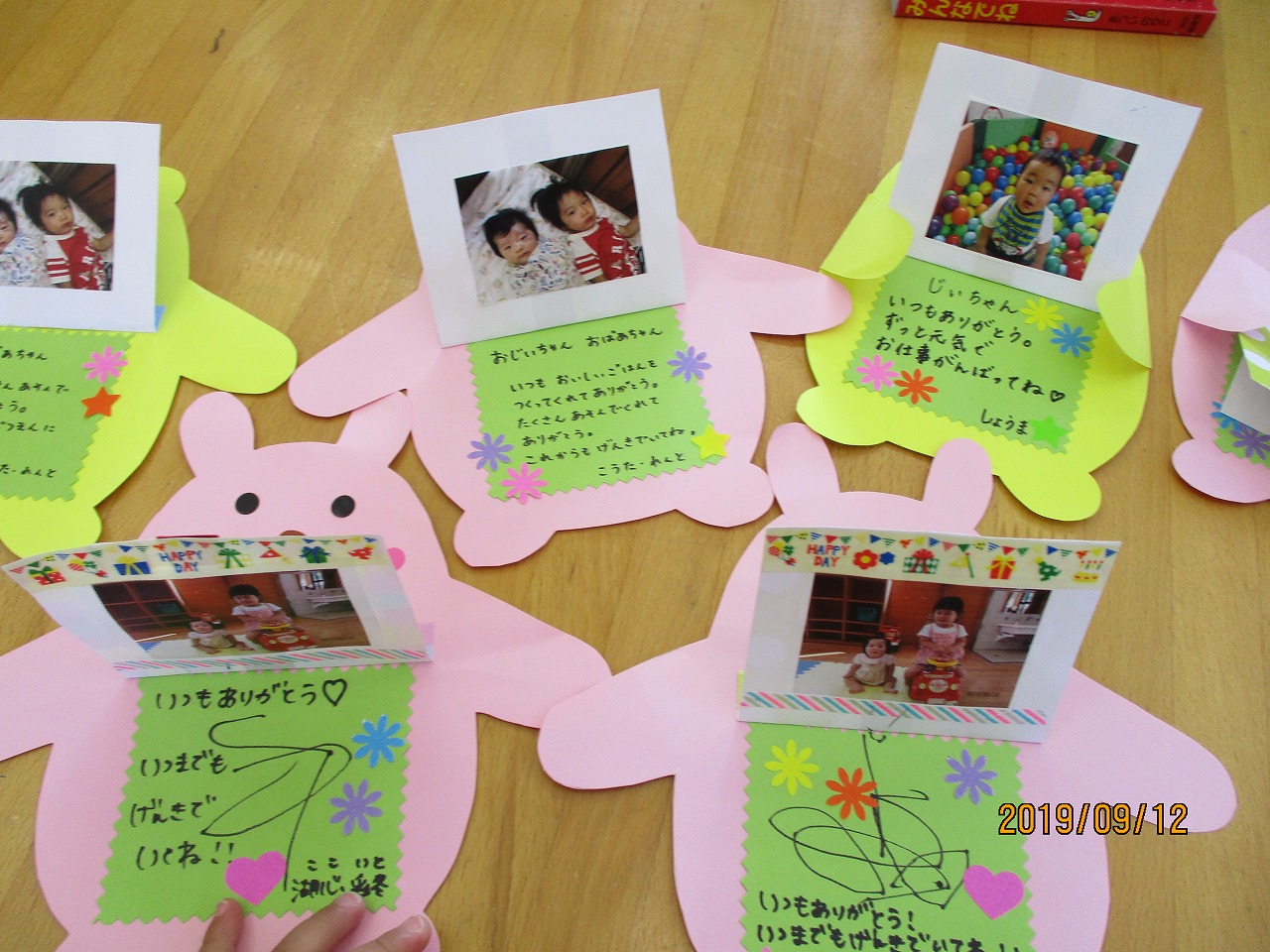 敬老の日にプレゼントするためにマスキングテープや型抜きを使ってうさぎとクマの台紙でメッセージカードを製作しました。 中には子どもの可愛い写真を貼りお母さんからの感謝のメッセージが添えられました。 マメールで萩原地区の方への案内もできるようになったため、今回は5組の参加がありとても賑やかでした。