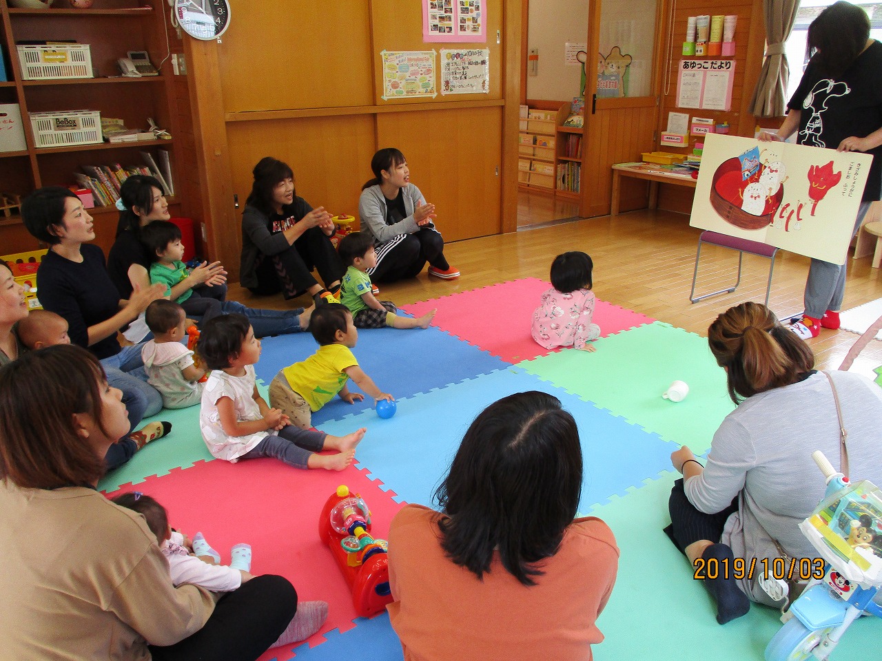 熊朋子さんを講師にお招きし、初めに手遊びをして親子で楽しみました。 その後子ども達の好きそうな絵本を何冊も読んでいただき、みんな真剣に聞き入っていました。 大型絵本のお弁当の話も手遊びのようにいっしょにやったりして楽しむことができました。 エプロンシアターでは大きなかぶのお話で2歳の子がお手伝いする場面もあり、和やかな雰囲気の中楽しむことができました。
