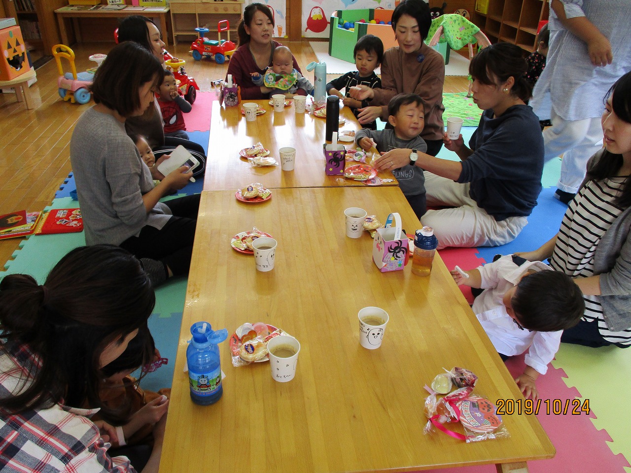 支援センターと乳幼児学級のコラボでハロウィンパーティーをしました。 可愛い仮装での参加が多く、楽しいパーティーとなりました。 クモが上がっていくゲームやお化けの玉入れゲーム、おもちゃ掴み、お菓子の首飾りなど楽しめる内容でした。 お茶会ではお茶とお菓子を用意し、色々な情報交換などをしたり楽しく過ごしました。