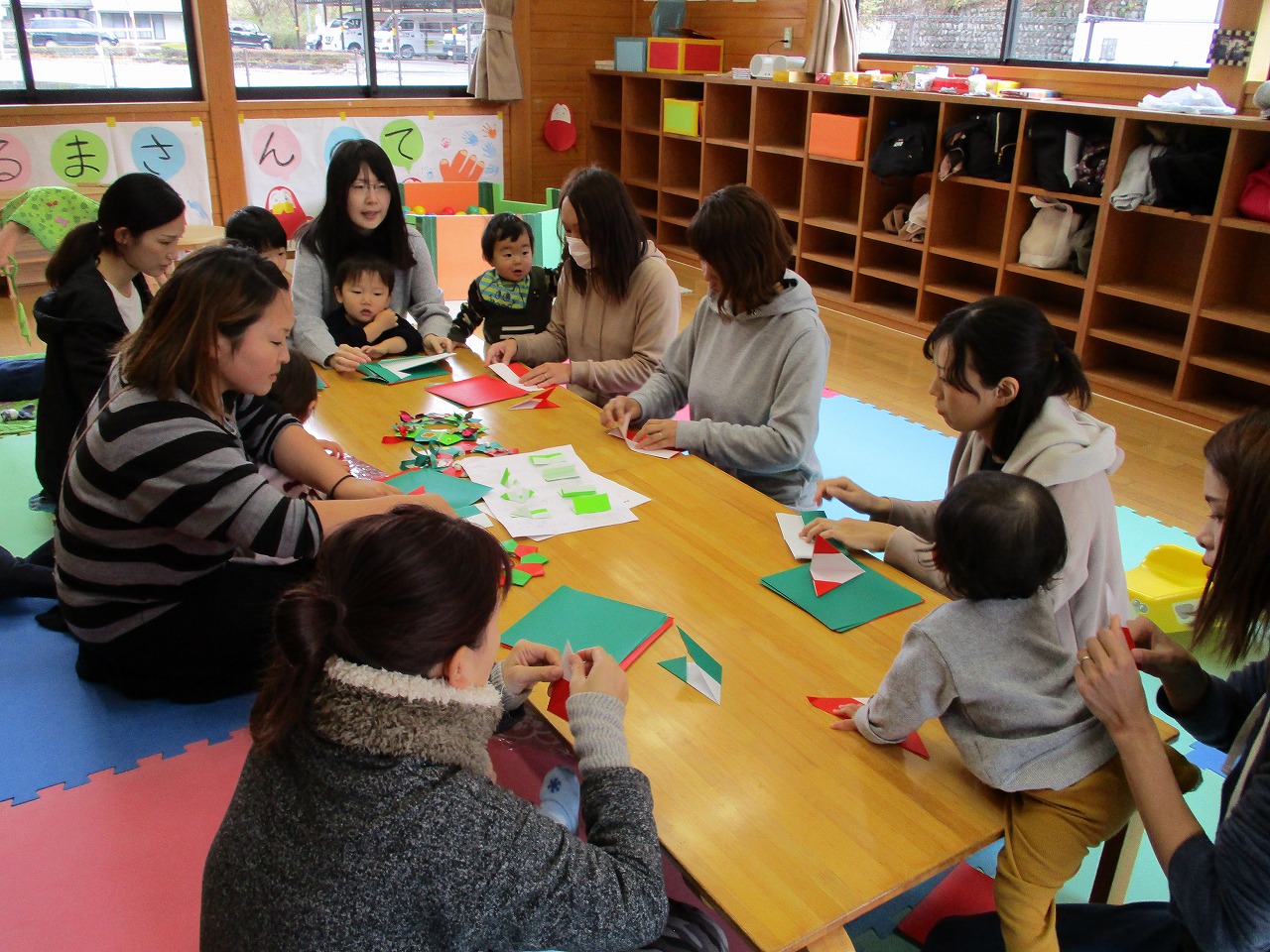 折り紙を折ってリースの台を作りました。折り紙をすることがないお母さん方は、一枚二枚目までは苦戦してみえましたが、慣れてくると要領がよくなり2種類の色で5枚ずつ綺麗に折り、組み合わせてリースの台を完成させました。サンタクロースとトナカイを付け、後は自由にどんぐりや星・天使のシールを貼って素敵にデコレーションして仕上げました。子ども達は、サンタクロース・トナカイの顔を描いたり、シールを貼って楽しみました。