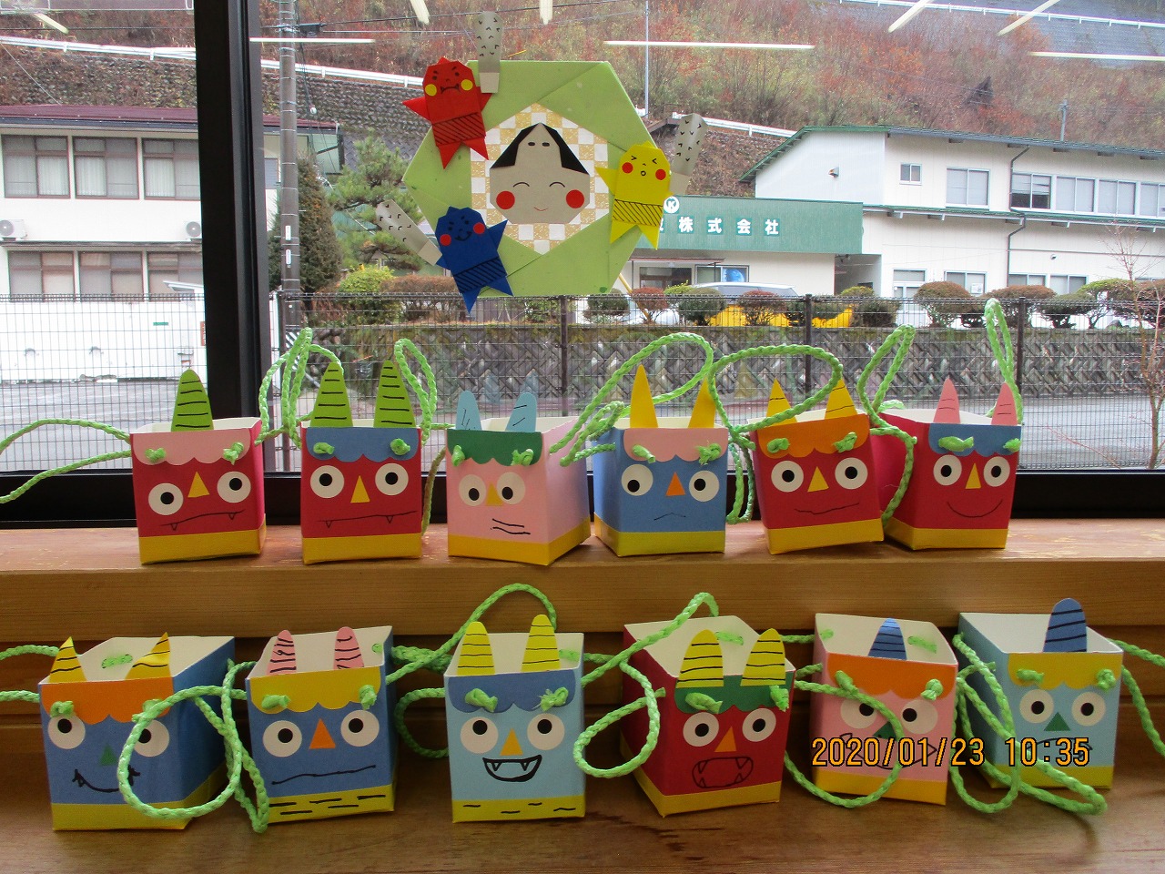 フラワー紙を髪の毛に見立てお面作り、牛乳パックを利用して豆箱作りを行いました。