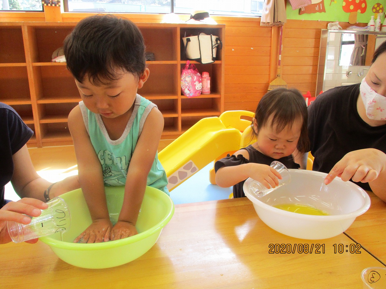 2歳・3歳のお子さんを対象に行い6組の親子が作りに来てくれました。水・洗たく糊を混ぜてぬるぬるするところにホウ砂液を少しずつ混ぜると、段々と固まりスライムの完成‼ とっても簡単に出来上がり、固まっていく様子に感動がありました。伸ばしたり、ぐちゃぐちゃにしたり、手の間から流したりとたくさん触って遊べました。