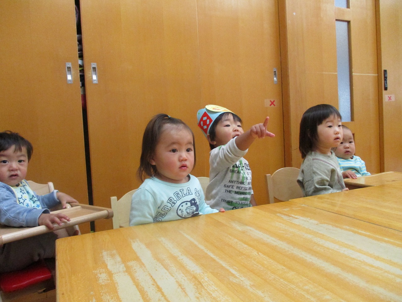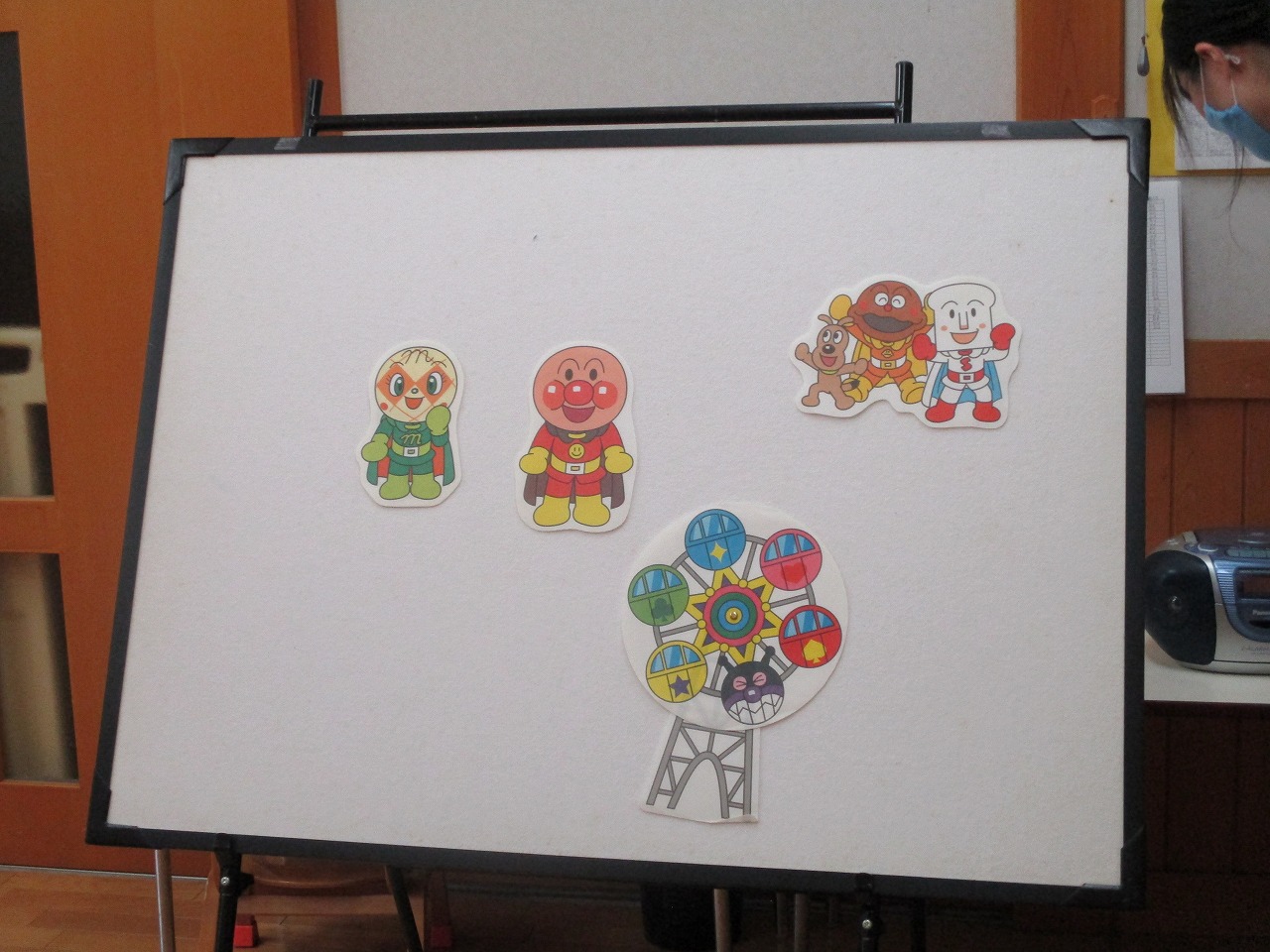 誕生児は1名。2歳になりました。大きくなったら「きょうりゅう」になりたいと教えてくれました。そして、ケーキのロウソクを自分で上手に吹き消すことができました。 お楽しみは手遊び「パン工場」とパネルシアター「アンパンマンのかくれんぼ」を行いました。みんな大好きなキャラクターなので登場するたびに名前を呼び、喜んで観てくれました。最後にアンパンマン体操を踊って楽しい誕生会になりました。