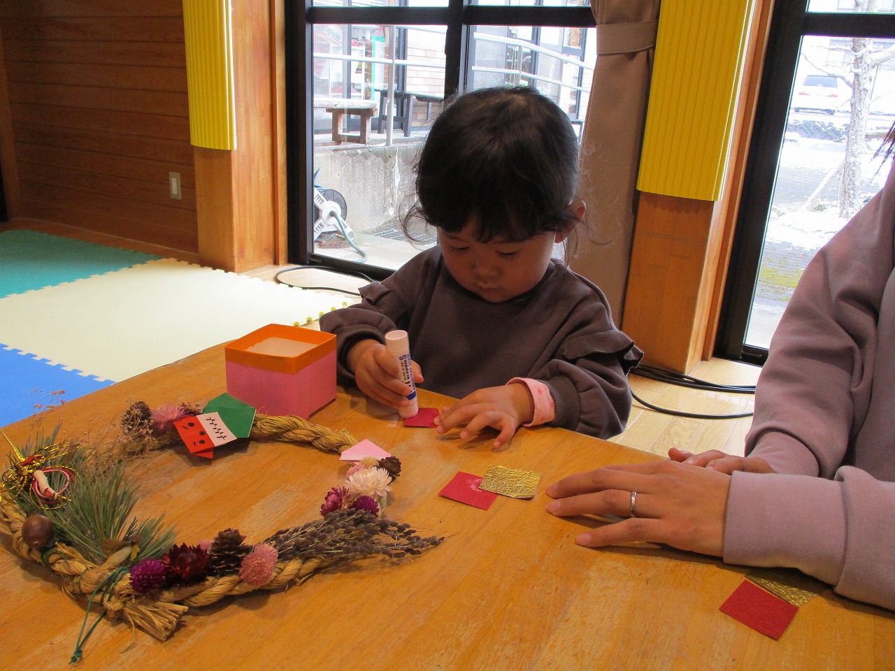 2日、9日と地域の方々にしめ縄を作っていただき、藁を扱いて水につけ藁を昔ながらの木づちで叩き本格的な作り方で作っていただきました。16日遊戯室で飾り付けを行い5組の親子の参加がありました。皆さん工夫やアイディアいっぱいで素敵な作品となり、楽しんで飾り付けができて良かったです。世界に一つだけのしめ縄飾り、お正月が楽しみですね。